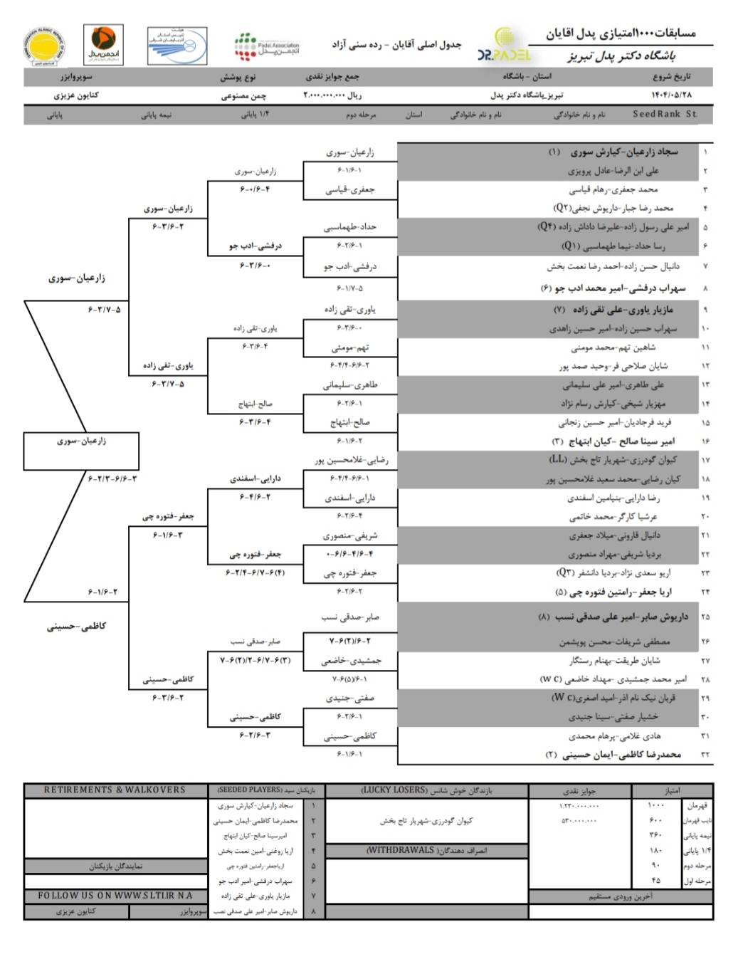 تیم محمدرضاکاظمی وایمان حسینی با قبول اولین باخت به مقام دومی قناعت کرد و تیمهای (مازیار یاوری با علی تقی زاده) و(آریا جعفر با رامتین فتوره چی) مشترکا" درسکوی سومی قرار گرفتند.